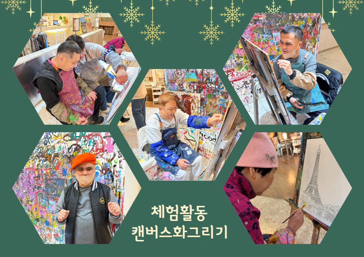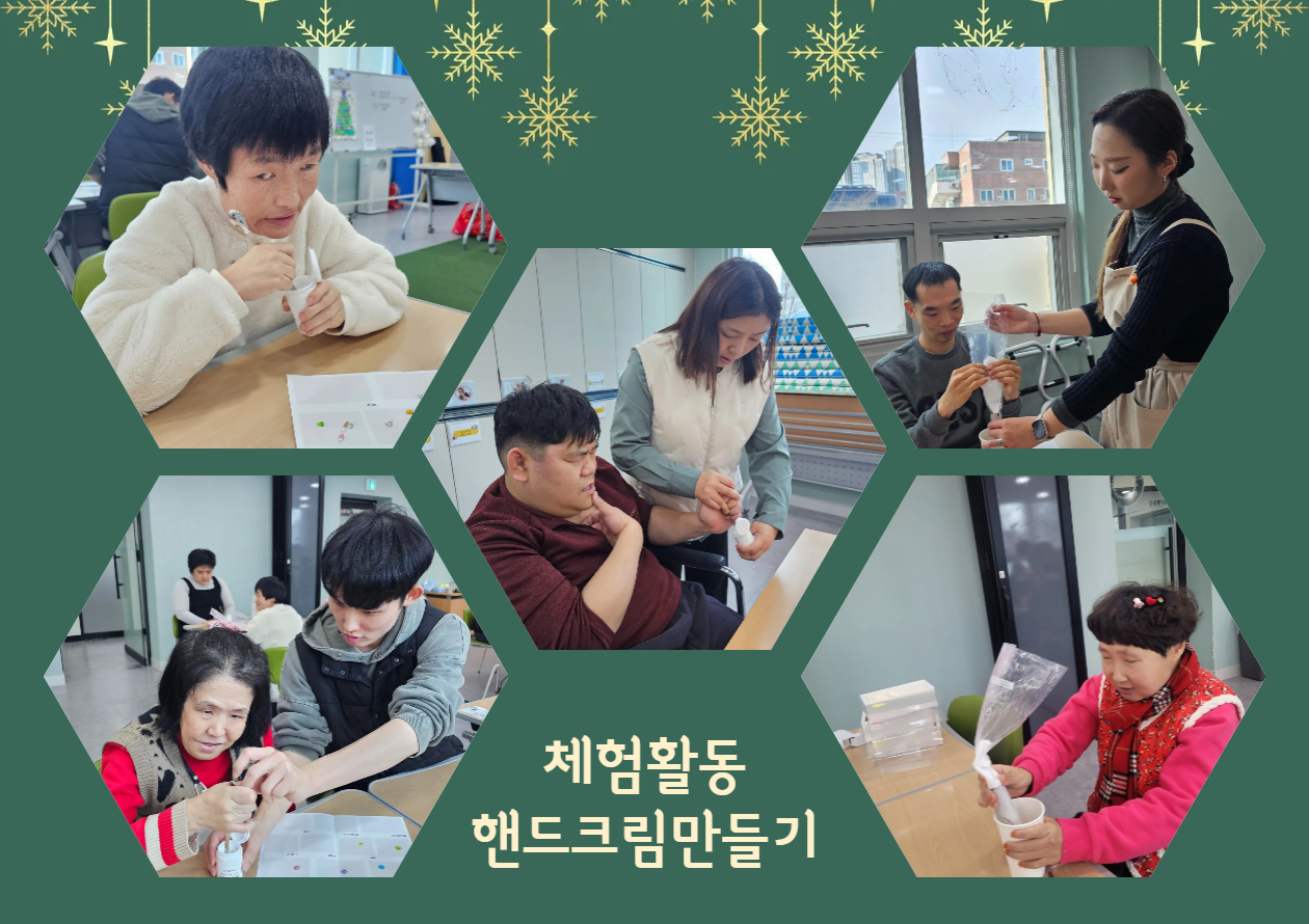 체험활동으로 두 그룹으로 나누어 캔버스화 그리기와 핸드크림 만들기를 진행하였습니다. 캔버스화 그리기에 참여한 이용인들은 화가가 된 듯한 기분으로 색을 입히며 작품을 완성했고, 완성된 그림을 보며 뿌듯해하는 모습을 보여주었습니다. 핸드크림 만들기에 참여한 이용인들은 조향 테스트를 통해 마음에 드는 향을 선택하여 직접 핸드크림을 완성하였으며, 겨울철 거칠어진 손을 부드럽게 가꿀 수 있을 것으로 기대됩니다.